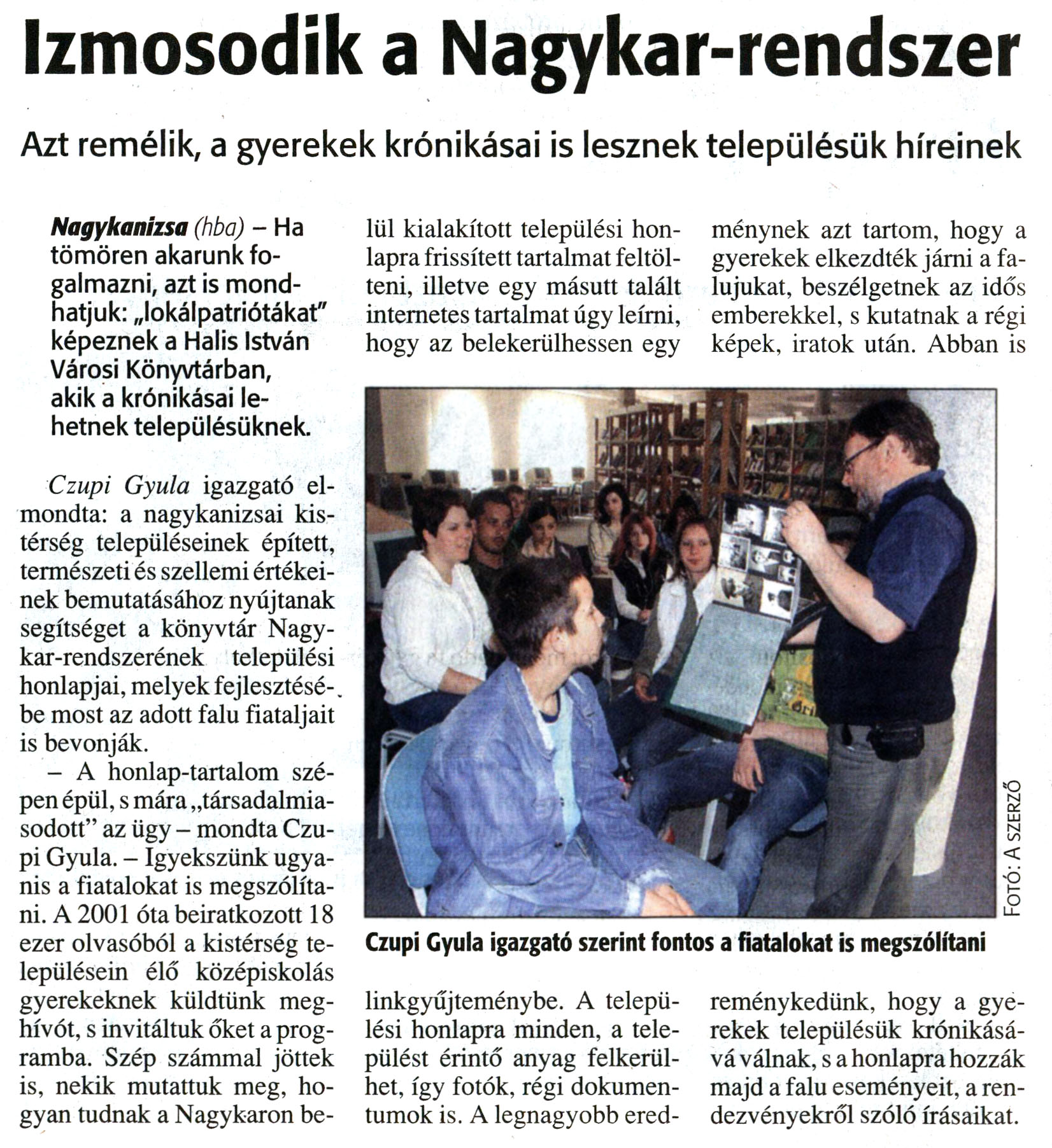 Nyilvános 14561 | 29190 | Zalai Hírlap 2008. június 9. 133. szám 12. oldal - Izmosodik a Nagykar-rendszer | A cikk szövege: Izmosodik a Nagykar-rendszer Azt remélik, a gyerekek krónikásai is lesznek településük híreinek Nagykanizsa (hba) - Ha tömören akarunk fogalmazni, azt is mondhatjuk: „lokálpatriótákat" képeznek a Halis István Városi Könyvtárban, akik a krónikásai lehetnek településüknek. Czupi Gyula igazgató elmondta: a nagykanizsai kistérség településeinek épített, természeti és szellemi értékeinek bemutatásához nyújtanak segítséget a könyvtár Nagykar-rendszerének települési honlapjai, melyek fejlesztésébe most az adott falu fiataljait is bevonják. - A honlap-tartalom szépen épül, s mára „társadalmiasodott" az ügy - mondta Czupi Gyula. - Igyekszünk ugyanis a fiatalokat is megszólítani. A 2001 óta beiratkozott 18 ezer olvasóból a kistérség településein élő középiskolás gyerekeknek küldtünk meghívót, s invitáltuk őket a programba. Szép számmal jöttek is, nekik mutattuk meg, hogyan tudnak a Nagykaron belül kialakított települési honlapra frissített tartalmat feltölteni, illetve egy másutt talált internetes tartalmat úgy leírni, hogy az belekerülhessen egy linkgyűjteménybe. A települési honlapra minden, a települést érintő anyag felkerülhet, így fotók, régi dokumentumok is. A legnagyobb eredménynek azt tartom, hogy a gyerekek elkezdték járni a falujukat, beszélgetnek az idős emberekkel, s kutatnak a régi képek, iratok után. Abban is reménykedünk, hogy a gyerekek településük krónikásává válnak, s a honlapra hozzák majd a falu eseményeit, a rendezvényekről szóló írásaikat. Képaláírás: Czupi Gyula igazgató szerint fontos a fiatalokat is megszólítani |
